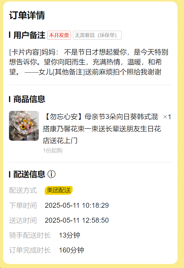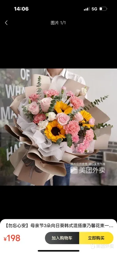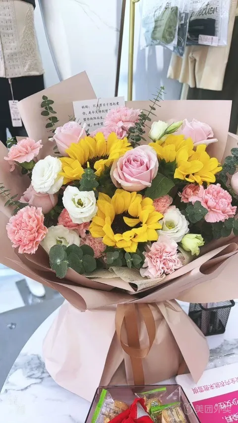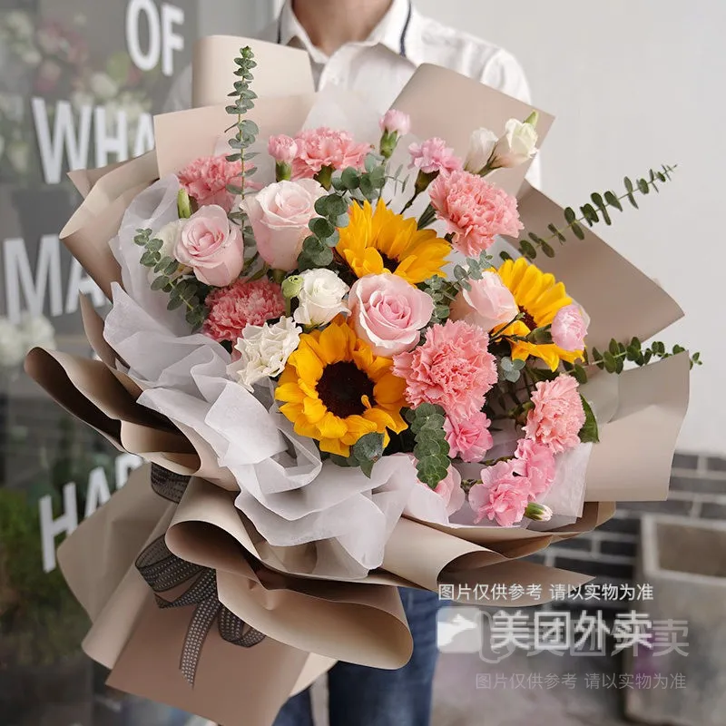 #【勿忘心安】母亲节3朵向日葵韩式混搭康乃馨花束一束送长辈送朋友生日花店送花上门# 随便包一下就完事的感觉,节日忙理解,超时一个多小时也没说啥,好歹是礼物,至少成品不能让人觉得是敷衍了事吧……