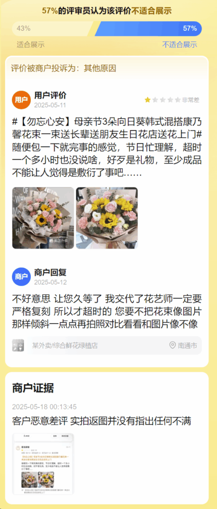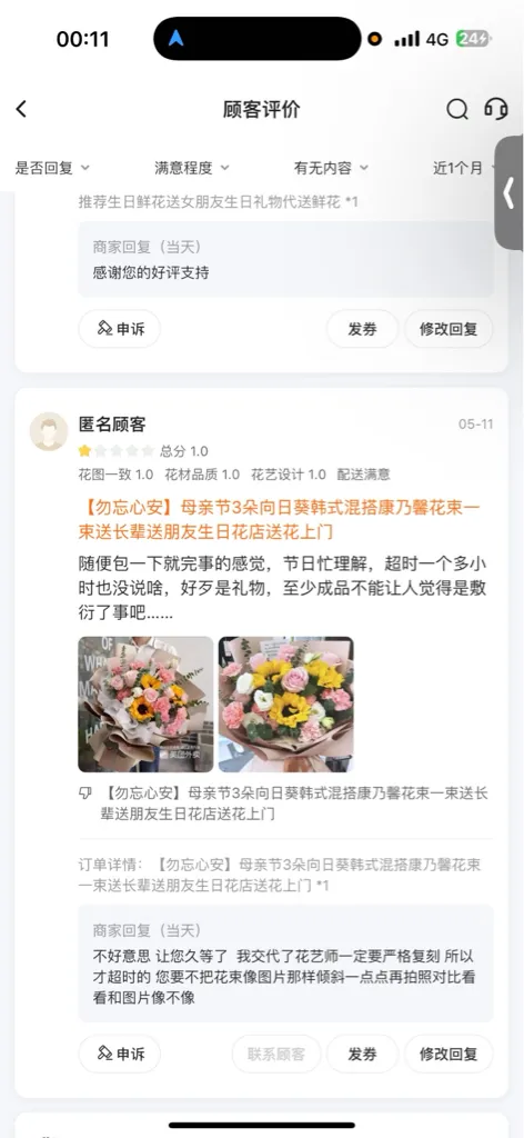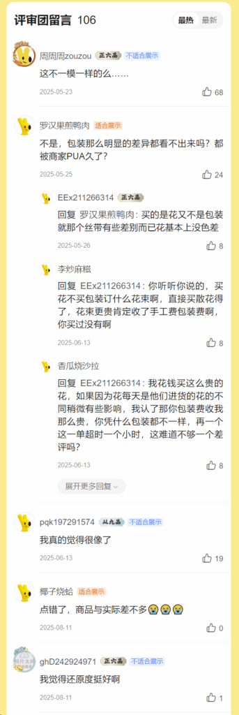 不好意思 让您久等了 我交代了花艺师一定要严格复刻 所以才超时的 您要不把花束像图片那样倾斜一点点再拍照对比看看和图片像不像