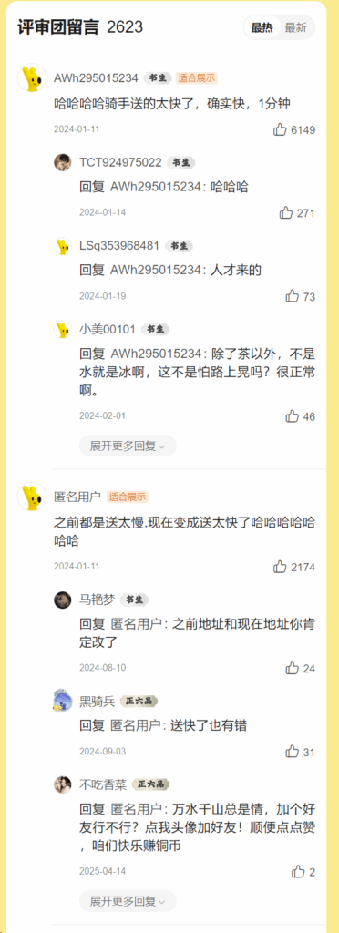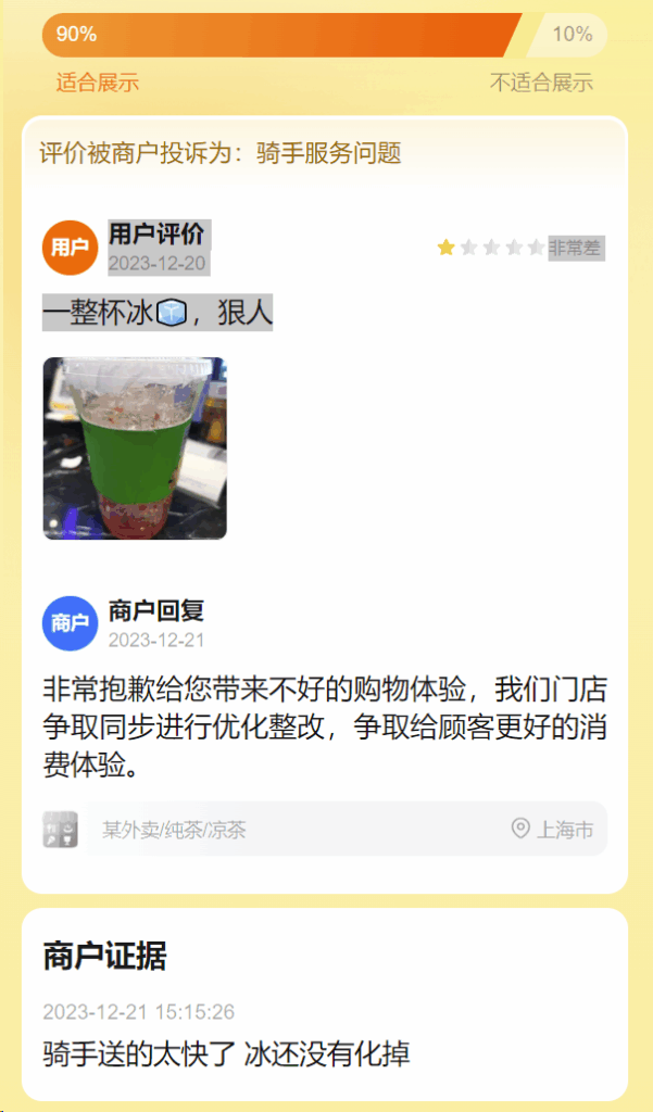 2025年8月11日 适合展示 适合展示 用户评价 2023-12-20 非常差 一整杯冰🧊,狠人 商户回复 2023-12-21 非常抱歉给您带来不好的购物体验,我们门店争取同步进行优化整改,争取给顾客更好的消费体验。
