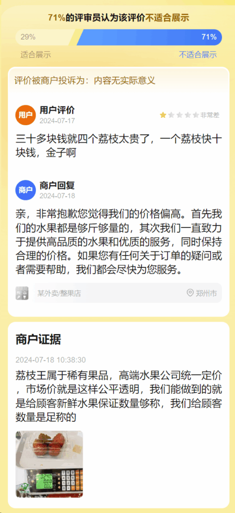评价被商户投诉为:内容无实际意义