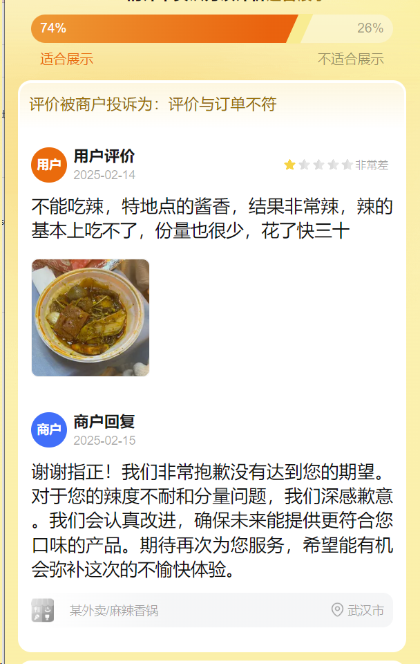谢谢指正!我们非常抱歉没有达到您的期望。对于您的辣度不耐和分量问题,我们深感歉意。我们会认真改进,确保未来能提供更符合您口味的产品。期待再次为您服务,希望能有机会弥补这次的不愉快体验。