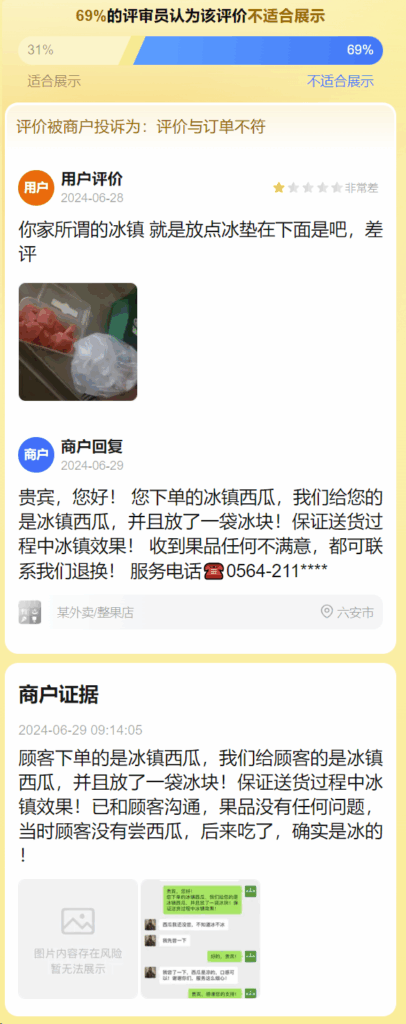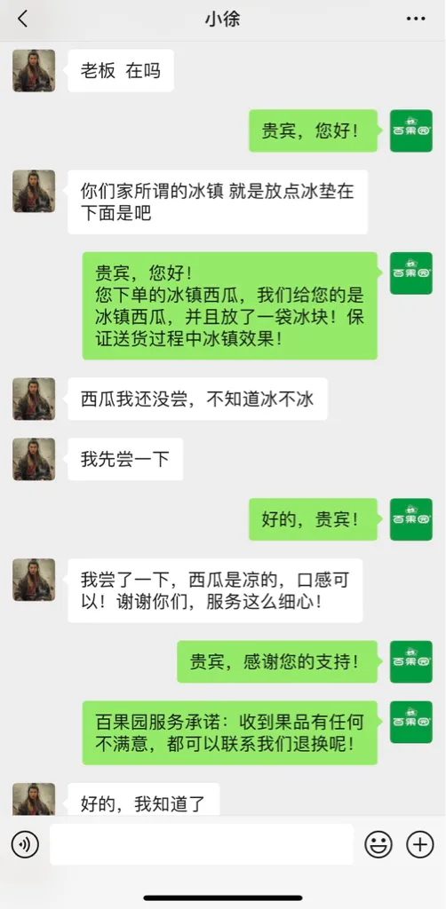 贵宾,您好! 您下单的冰镇西瓜,我们给您的是冰镇西瓜,并且放了一袋冰块!保证送货过程中冰镇效果! 收到果品任何不满意,都可联系我们退换! 服务电话☎️0564-211****