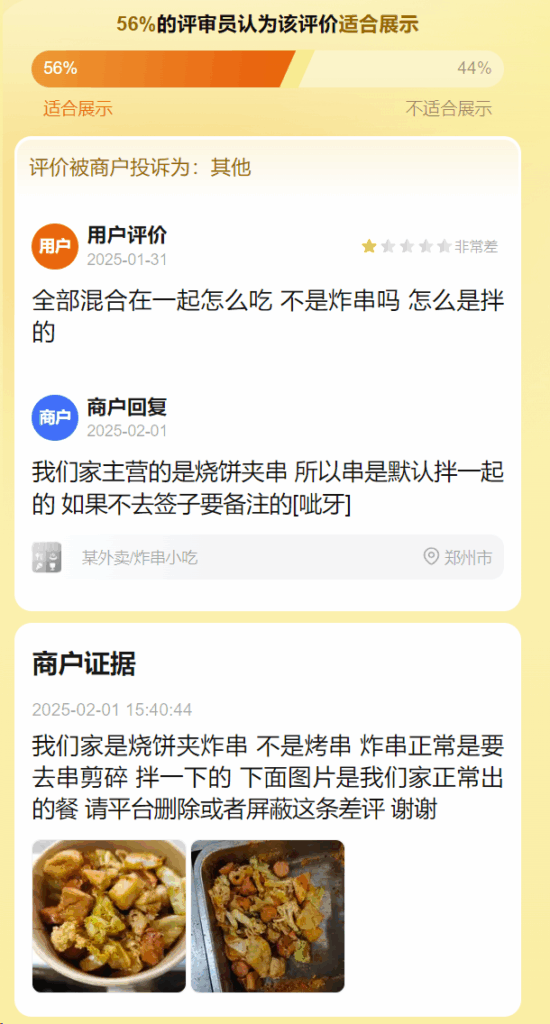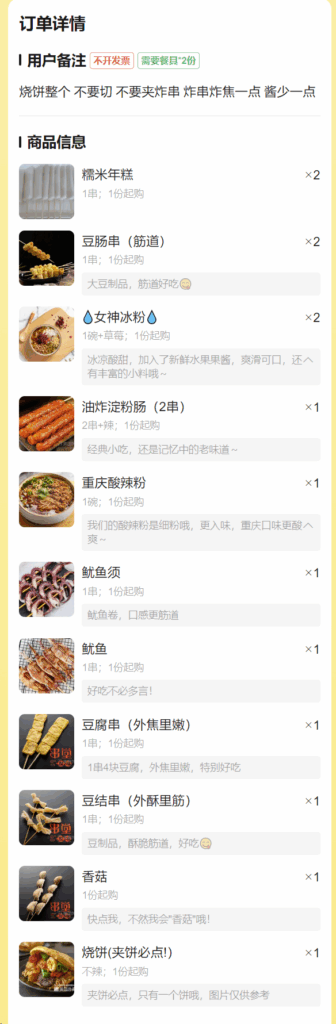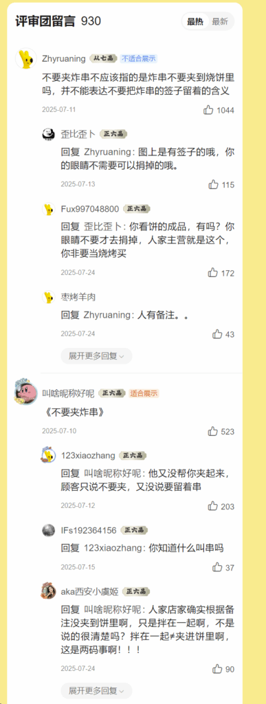 2025年8月11日 适合展示 适合展示 用户评价 2025-01-31 非常差 全部混合在一起怎么吃 不是炸串吗 怎么是拌的 商户 商户回复 2025-02-01 我们家主营的是烧饼夹串 所以串是默认拌一起的 如果不去签子要备注的[呲牙]