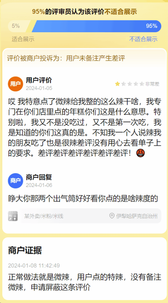 正常做法就是微辣,用户点的特辣,没有备注微辣,申请屏蔽这条评价