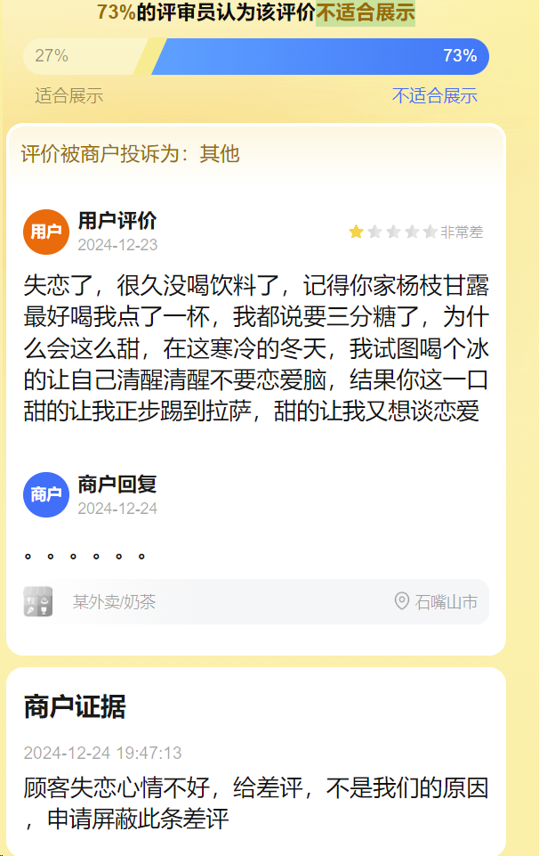 失恋了,很久没喝饮料了,记得你家杨枝甘露最好喝我点了一杯,我都说要三分糖了,为什么会这么甜,在这寒冷的冬天,我试图喝个冰的让自己清醒清醒不要恋爱脑,结果你这一口甜的让我正步踢到拉萨,甜的让我又想谈恋爱 不适合展示