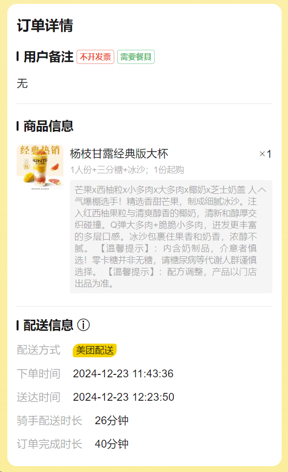 失恋了,很久没喝饮料了,记得你家杨枝甘露最好喝我点了一杯,我都说要三分糖了,为什么会这么甜,在这寒冷的冬天,我试图喝个冰的让自己清醒清醒不要恋爱脑,结果你这一口甜的让我正步踢到拉萨,甜的让我又想谈恋爱