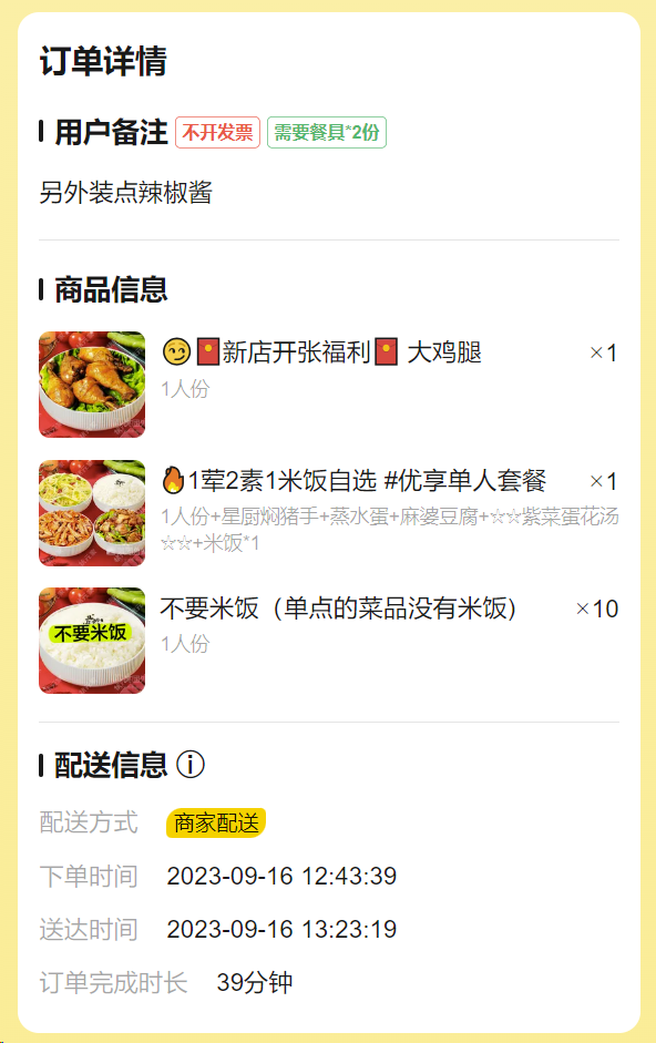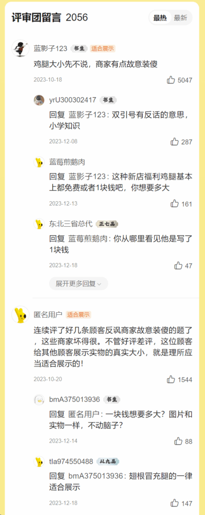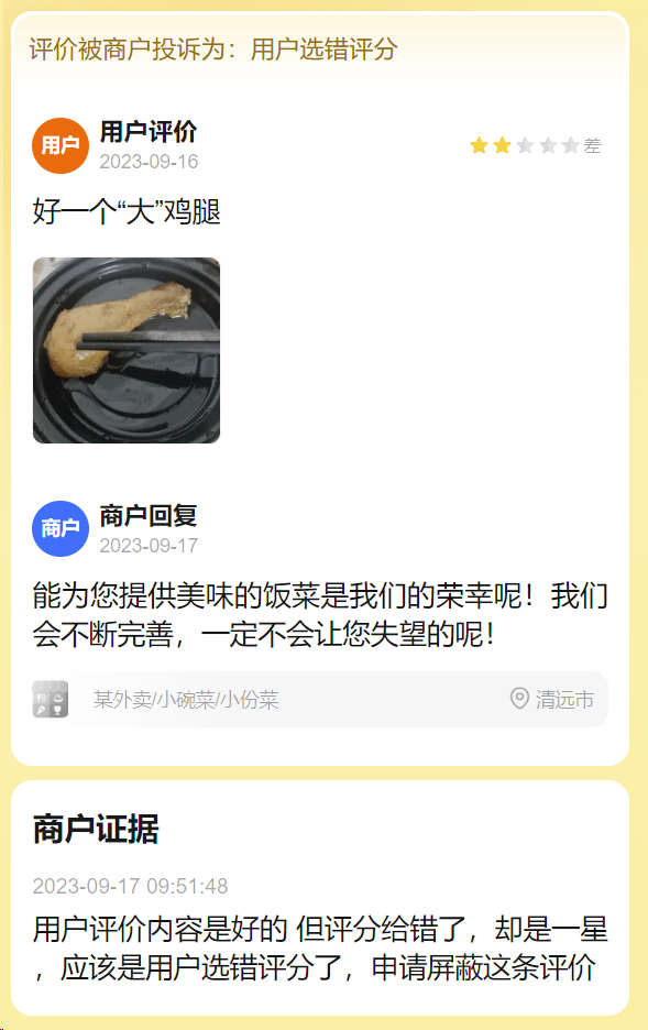 好一个“大”鸡腿 适合展示 2025年8月11日 适合展示 适合展示 用户评价 2023-09-16 差 好一个“大”鸡腿 商户 商户回复 2023-09-17 能为您提供美味的饭菜是我们的荣幸呢!我们会不断完善,一定不会让您失望的呢! 某外卖/小碗菜/小份菜 清远市