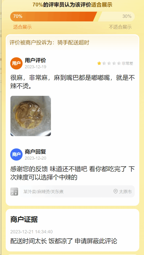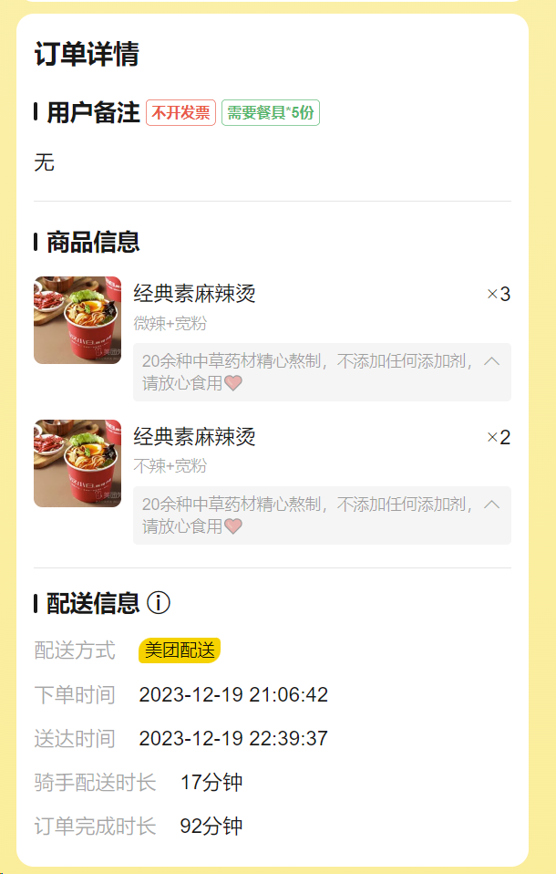 配送时间太长 饭都凉了 申请屏蔽此评论