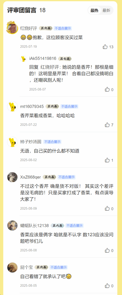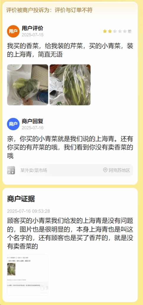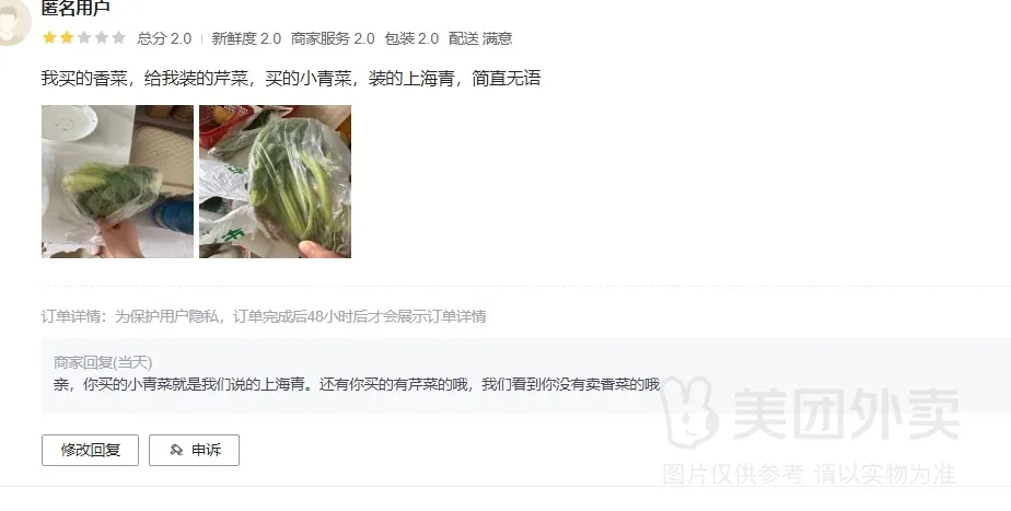 我买的香菜,给我装的芹菜,买的小青菜,装的上海青,简直无语