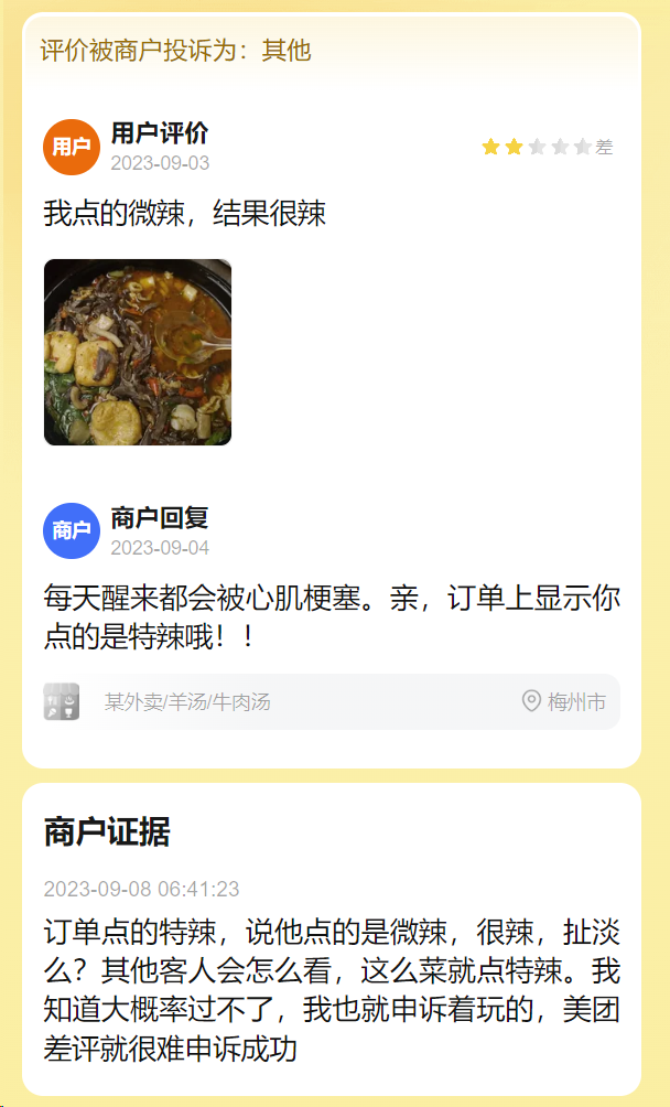 订单点的特辣,说他点的是微辣,很辣,扯淡么?其他客人会怎么看,这么菜就点特辣。我知道大概率过不了,我也就申诉着玩的,美团差评就很难申诉成功