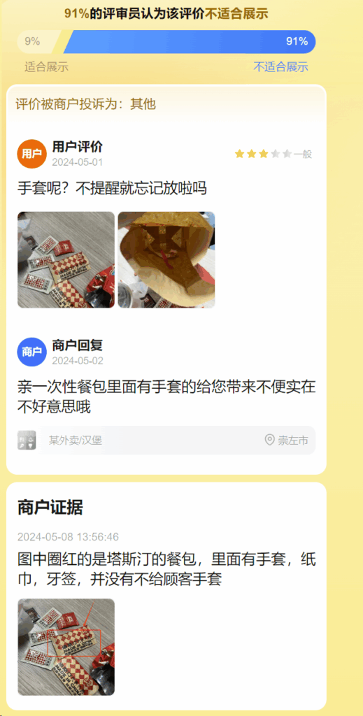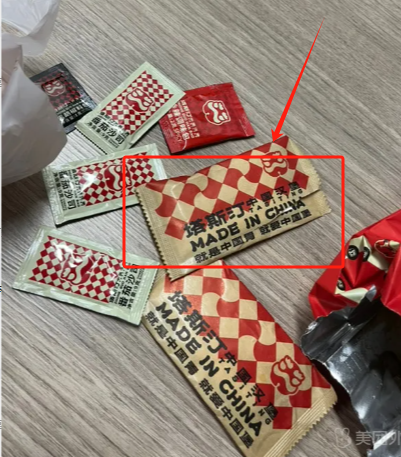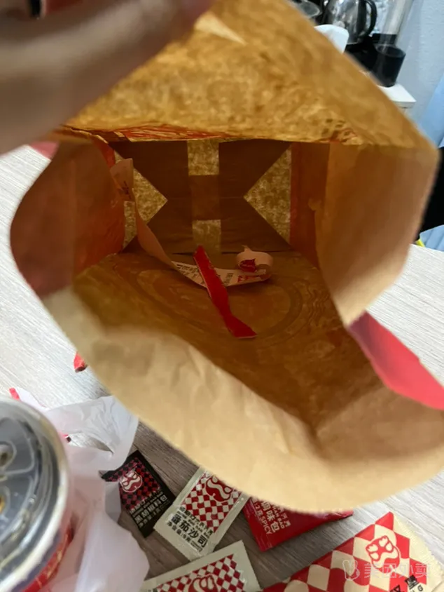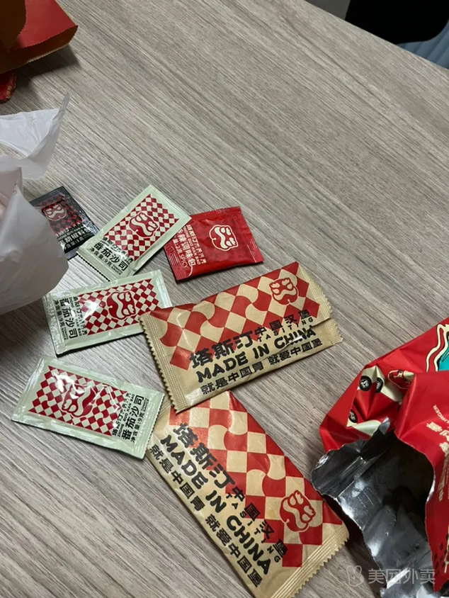 图中圈红的是塔斯汀的餐包,里面有手套,纸巾,牙签,并没有不给顾客手套