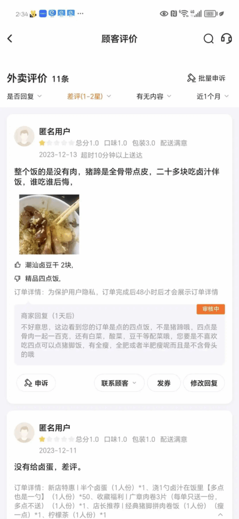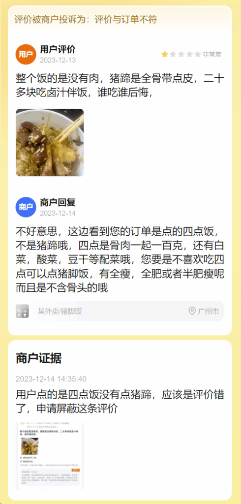 不好意思,这边看到您的订单是点的四点饭,不是猪蹄哦,四点是骨肉一起一百克,还有白菜,酸菜,豆干等配菜哦,您要是不喜欢吃四点可以点猪脚饭,有全瘦,全肥或者半肥瘦呢而且是不含骨头的哦