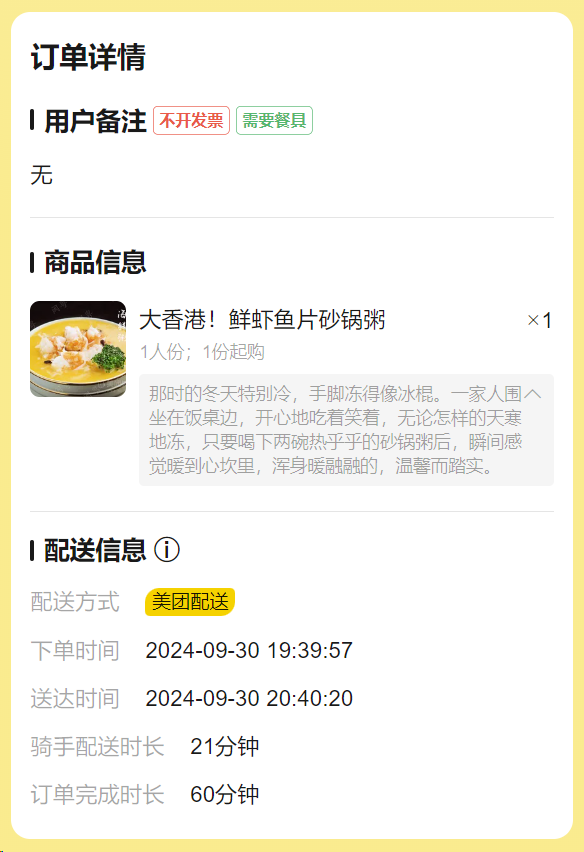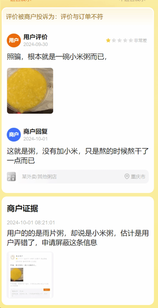 照骗,根本就是一碗小米粥而已 适合展示 2025年8月11日 适合展示 适合展示 用户评价 2024-09-30 非常差 照骗,根本就是一碗小米粥而已 商户回复 2024-10-01 这就是粥,没有加小米,只是熬的时候熬干了一点而已