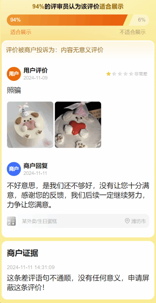 2025年8月11日 适合展示 适合展示 用户评价 2024-11-09 非常差 照骗 商户回复 2024-11-11 不好意思,是我们还不够好,没有让您十分满意,感谢您的反馈,我们后续一定继续努力,力争让您满意。