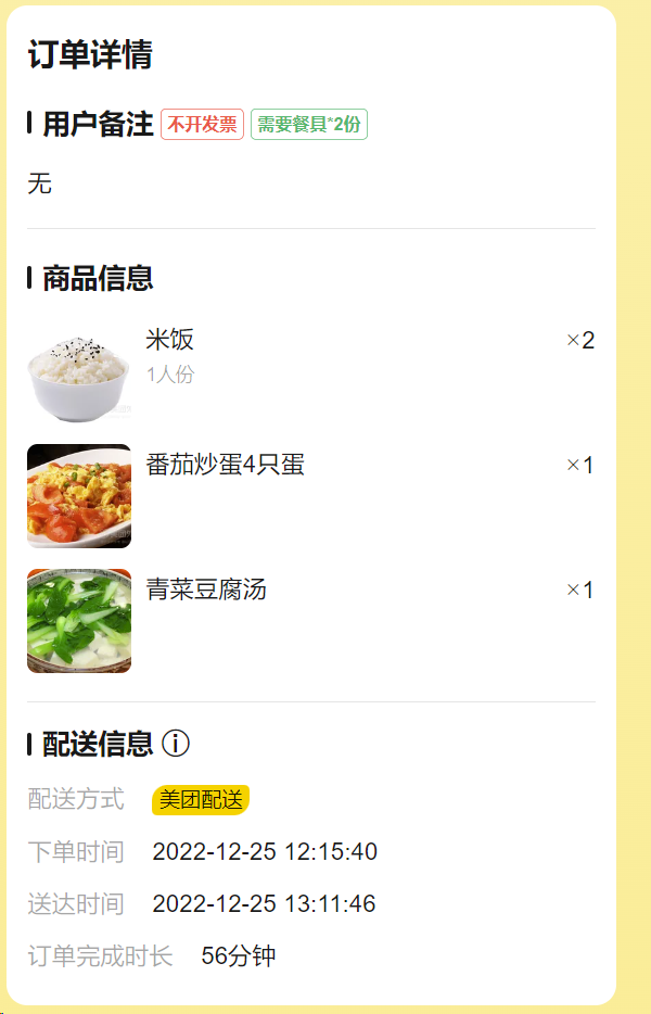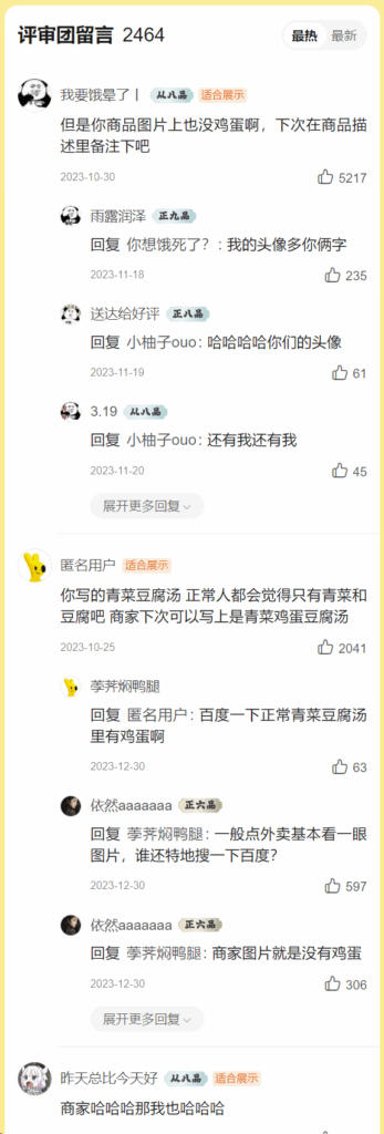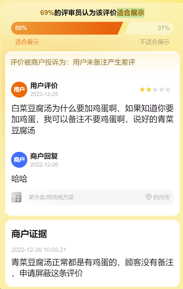 2025年8月11日 适合展示 适合展示 用户评价 2022-12-25 白菜豆腐汤为什么要加鸡蛋啊、如果知道你要加鸡蛋,我可以备注不要鸡蛋啊,说好的青菜豆腐汤 商户 商户回复 2022-12-26 哈哈