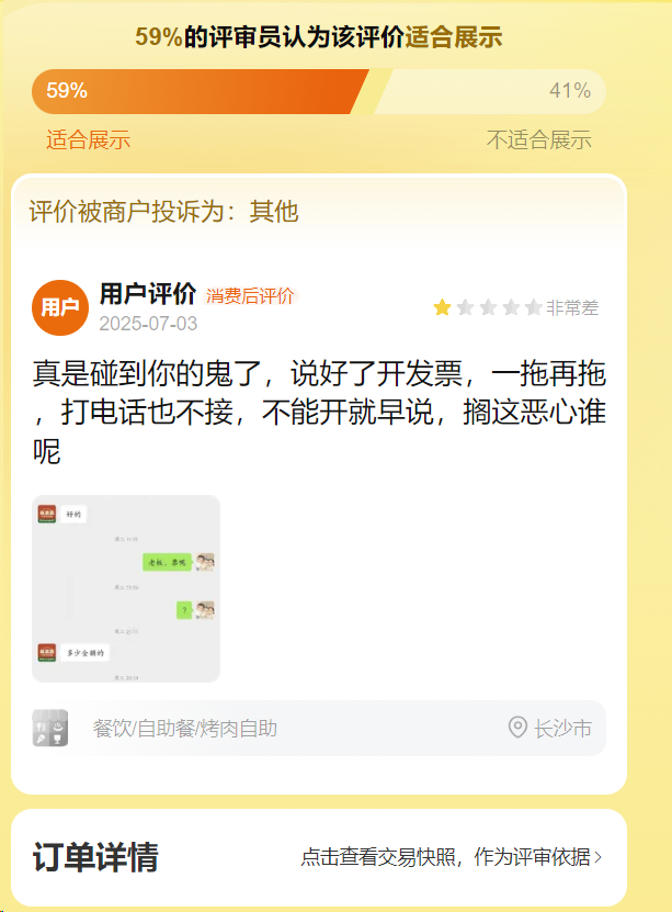 真是碰到你的鬼了,说好了开发票,一拖再拖,打电话也不接,不能开就早说,搁这恶心谁呢 适合展示 2025年8月11日 适合展示 适合展示 用户评价消费后评价 2025-07-03 非常差 真是碰到你的鬼了,说好了开发票,一拖再拖,打电话也不接,不能开就早说,搁这恶心谁呢