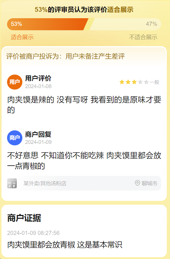 2025年8月11日 适合展示 适合展示 用户评价 2024-01-08 一般 肉夹馍是辣的 没有写呀 我看到的是原味才要的 商户 商户回复 2024-01-09 不好意思 不知道你不能吃辣 肉夹馍里都会放一点青椒的