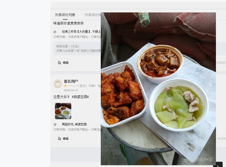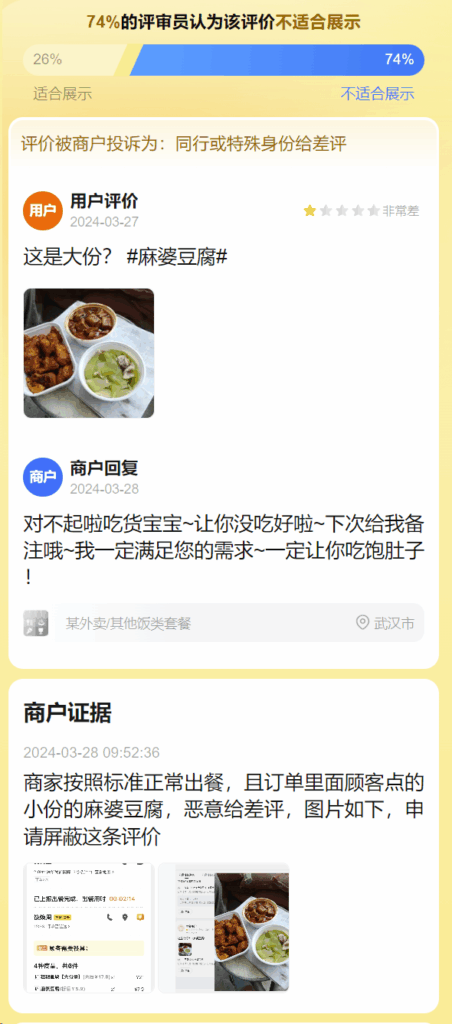 商家按照标准正常出餐,且订单里面顾客点的小份的麻婆豆腐,恶意给差评,图片如下,申请屏蔽这条评价