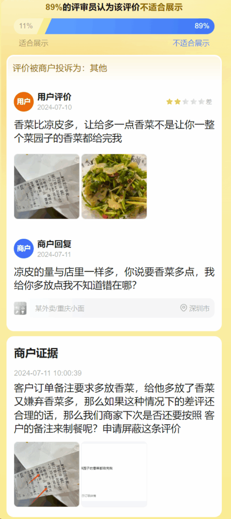 香菜比凉皮多,让给多一点香菜不是让你一整个菜园子的香菜都给完我 不适合展示 2025年8月11日 不适合展示 不适合展示 用户评价 2024-07-10 差 香菜比凉皮多,让给多一点香菜不是让你一整个菜园子的香菜都给完我 商户回复 2024-07-11 凉皮的量与店里一样多,你说要香菜多点,我给你多放点我不知道错在哪?