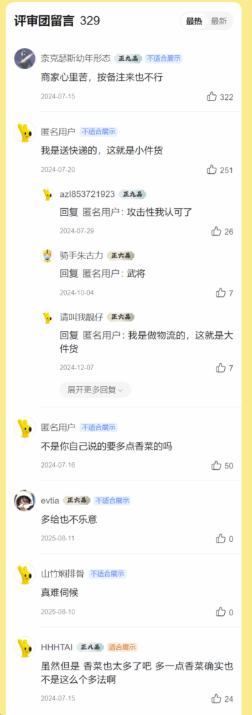 2025年8月11日 不适合展示 不适合展示 用户评价 2024-07-10 差 香菜比凉皮多,让给多一点香菜不是让你一整个菜园子的香菜都给完我 商户回复 2024-07-11 凉皮的量与店里一样多,你说要香菜多点,我给你多放点我不知道错在哪?