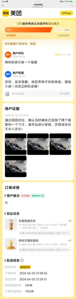 2025年8月12日 适合展示 72%的评审员认为该评价适合展示 用户评价2024-06-03两杯奶茶只有一个吸管商户回复2024-06-04您好,实在抱歉,给您带来不好的体验,请给小店一次改正的机会哦!