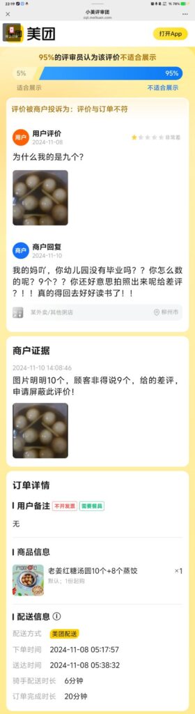 2025年8月12日 不适合展示 95%的评审员认为该评价不适合展示 用户评价2024-11-08非常差为什么我的是九个?商户回复2024-11-10我的妈吖,你幼儿园没有毕业吗??你怎么数的呢?9个??你还好意思拍照出来呢给差评?!!真的得回去好好读书了!!