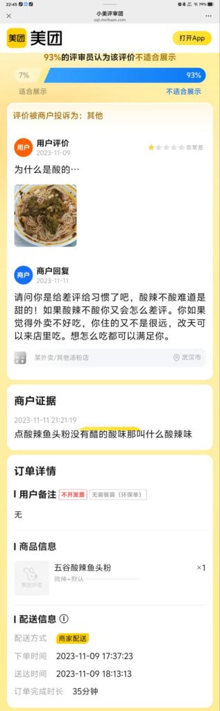 请问你是给差评给习惯了吧,酸辣不酸难道是甜的!如果酸辣不酸你又会怎么差评。你如果觉得外卖不好吃,你住的又不是很远,改天可以来店里吃。想怎么吃都可以满足你。