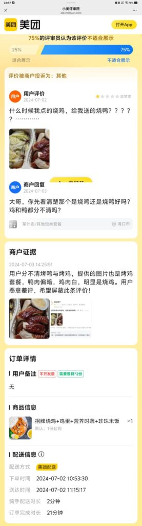 2025年8月12日 不适合展示 75%的评审员认为该评价不适合展示 用户评价2024-07-02什么时候我点的烧鸡,给我送的烧鸭?????…………商户回复2024-07-03大哥,你先看清楚那个是烧鸡还是烧鸭好吗?鸡和鸭都分不清吗?
