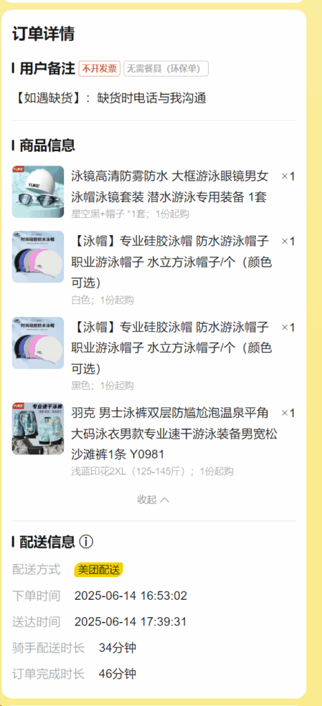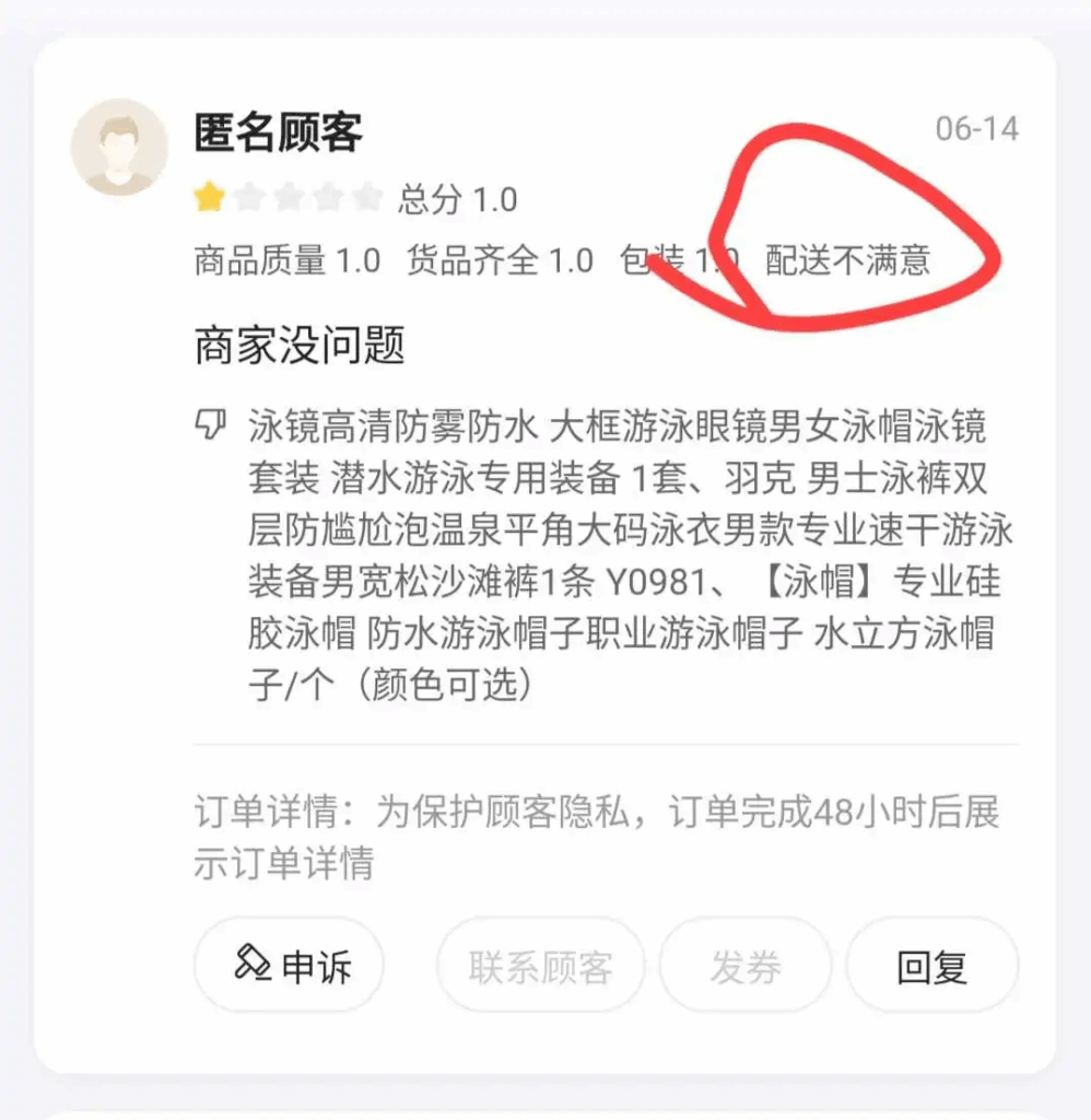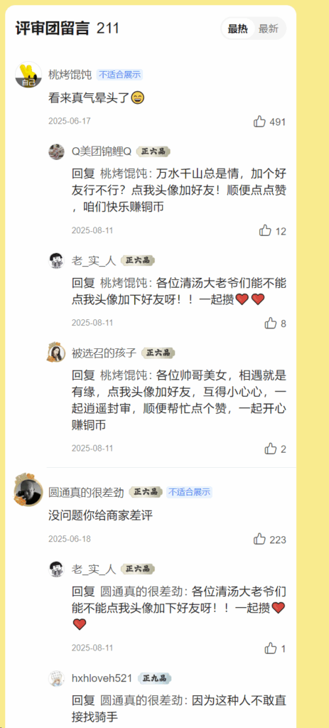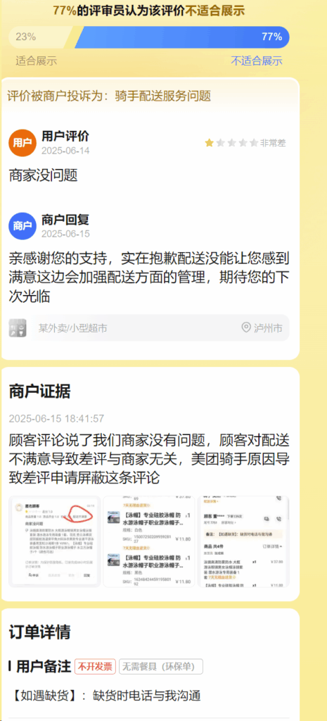 2025年8月12日 不适合展示 不适合展示 评价被商户投诉为:骑手配送服务问题 用户 用户评价 2025-06-14 非常差 商家没问题 商户 商户回复 2025-06-15 亲感谢您的支持,实在抱歉配送没能让您感到满意这边会加强配送方面的管理,期待您的下次光临