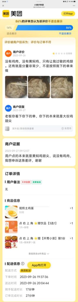 2025年8月12日 不适合展示 86%的评审员认为该评价不适合展示 用户评价2023-09-26没有鸡肉,没有黄焖鸡,只有让我过敏的鸡翅。还有就是分量非常少,不是按照我下的单来做商户回复2023-09-27老板你看下你下的单,你下的本来就是大份鸡翅尖