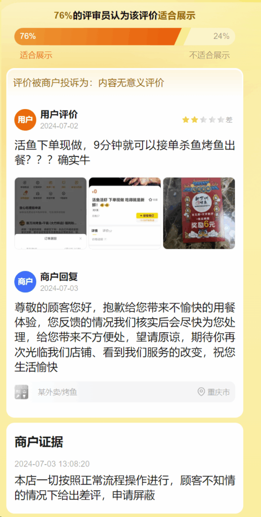 本店一切按照正常流程操作进行,顾客不知情的情况下给出差评,申请屏蔽