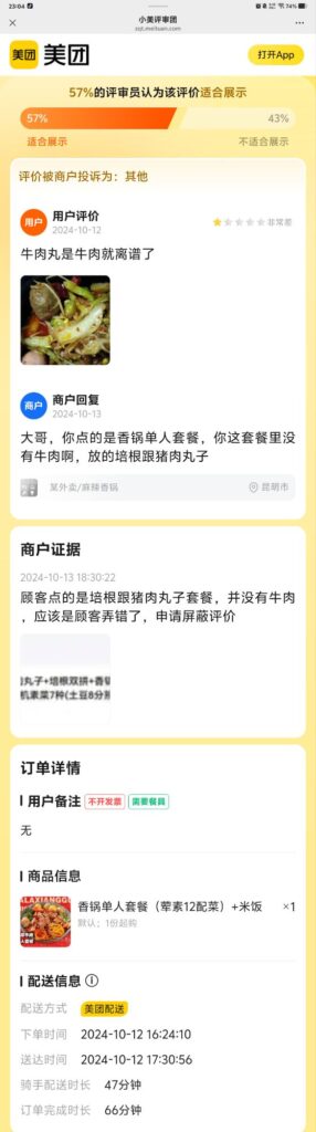 牛肉丸是牛肉就离谱了 2025年8月12日 适合展示 57%的评审员认为该评价适合展示 用户评价2024-10-12牛肉丸是牛肉就离谱了商户回复2024-10-13大哥,你点的是香锅单人套餐,你这套餐里没有牛肉啊,放的培根跟猪肉丸子
