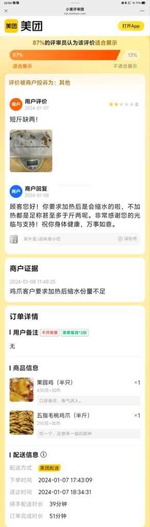 2025年8月12日 适合展示 87%的评审员认为该评价适合展示 用户评价2024-01-07短斤缺两!商户回复2024-01-08顾客您好!你要求加热后是会缩水的啦,不加热都是足称甚至多于斤两呢。非常感谢您的光临与支持!祝你身体健康,万事如意。