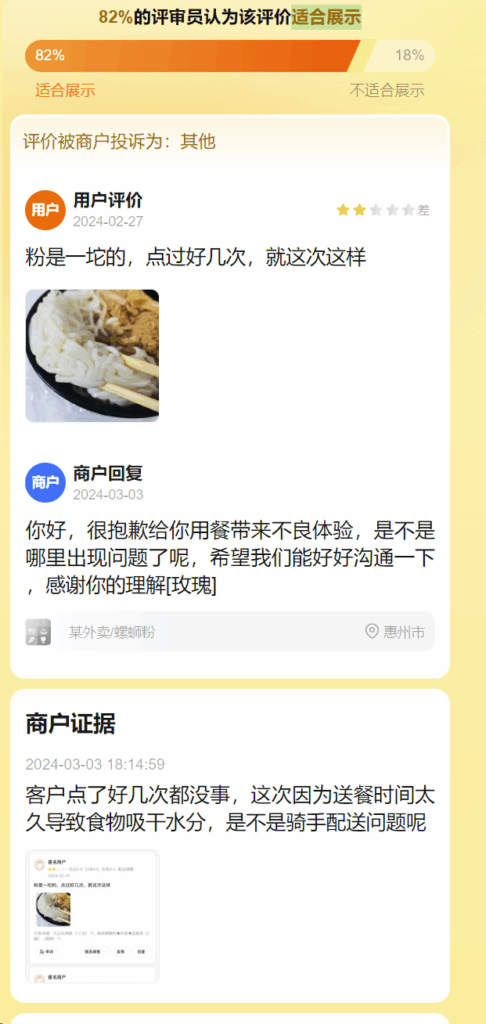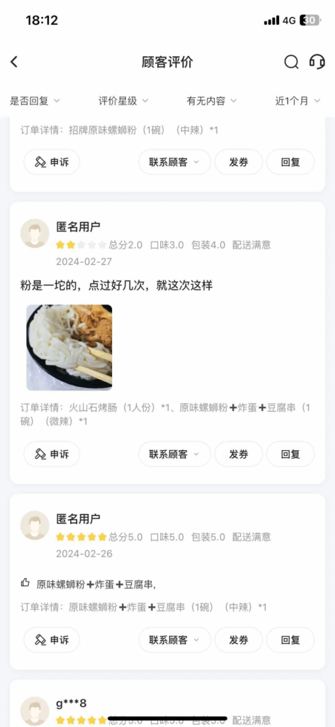 粉是一坨的,点过好几次,就这次这样 适合展示 2025年8月12日 适合展示 适合展示 用户评价 2024-02-27 差 粉是一坨的,点过好几次,就这次这样 商户回复 2024-03-03 你好,很抱歉给你用餐带来不良体验,是不是哪里出现问题了呢,希望我们能好好沟通一下,感谢你的理解[玫瑰]