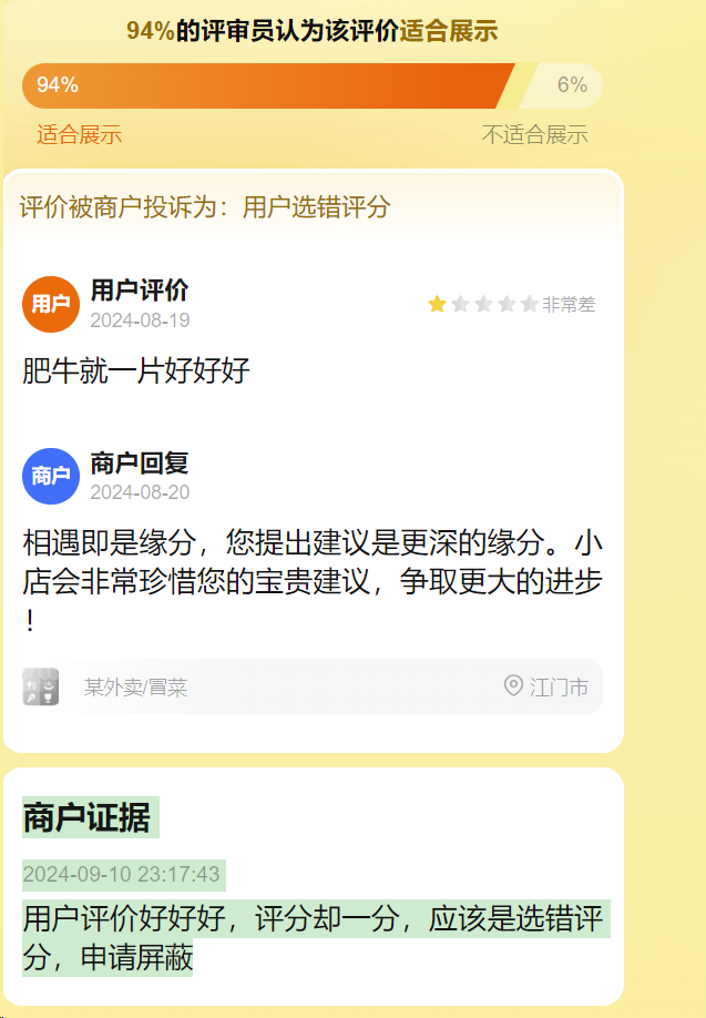 用户评价好好好,评分却一分,应该是选错评分,申请屏蔽