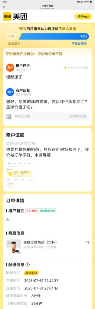 您好,您要的冰的奶茶,然后评价饭都凉了?是评价错了吧?