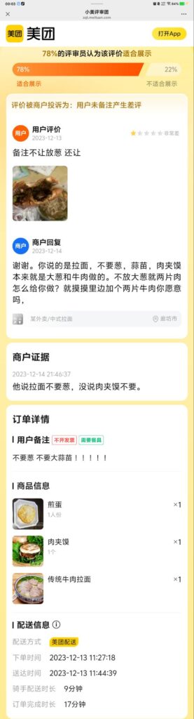 2025年8月13日 适合展示 78%的评审员认为该评价适合展示 用户评价2023-12-13备注不让放葱 还让商户回复2023-12-14谢谢。你说的是拉面,不要葱,蒜苗,肉夹馍本来就是大葱和牛肉做的。不放大葱就两片肉怎么给你做?就摸摸里边加个两片牛肉你愿意吗,