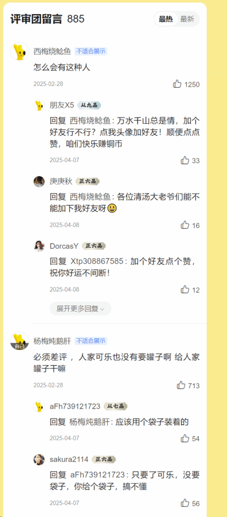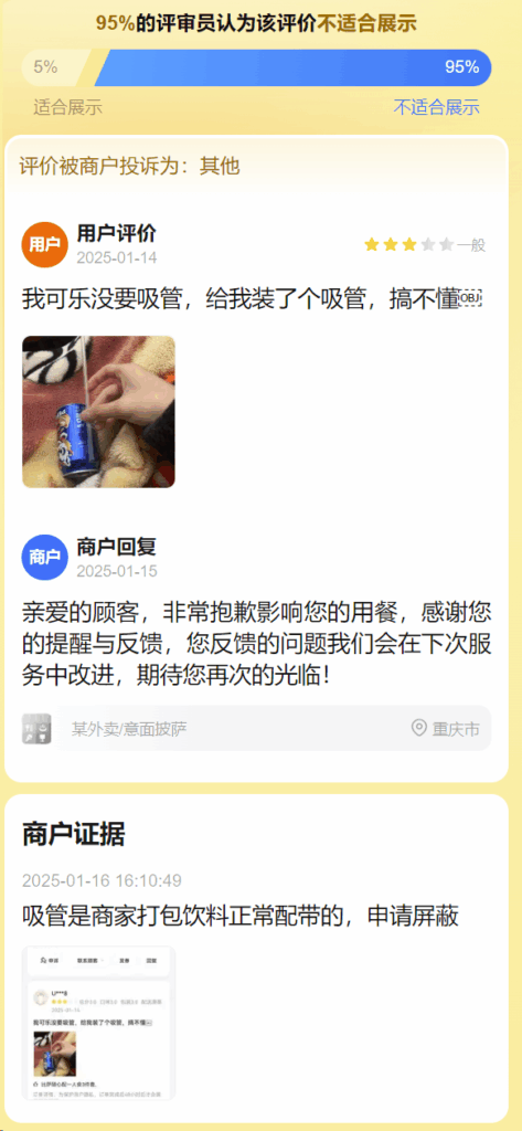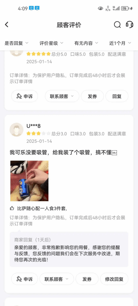 我可乐没要吸管,给我装了个吸管,搞不懂 不适合展示 2025年8月13日 不适合展示 用户评价 2025-01-14 一般 我可乐没要吸管,给我装了个吸管,搞不懂 商户回复 2025-01-15 亲爱的顾客,非常抱歉影响您的用餐,感谢您的提醒与反馈,您反馈的问题我们会在下次服务中改进,期待您再次的光临!