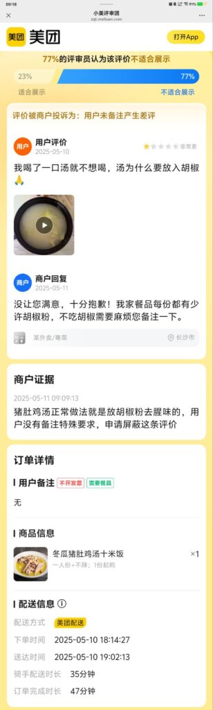 2025年8月13日 不适合展示 77%的评审员认为该评价不适合展示 用户评价2025-05-10我喝了一口汤就不想喝,汤为什么要放入胡椒🙏商户回复2025-05-11没让您满意,十分抱歉!我家餐品每份都有少许胡椒粉,不吃胡椒需要麻烦您备注一下。