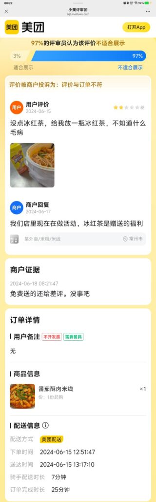 2025年8月13日 不适合展示 97%的评审员认为该评价不适合展示 用户评价2024-06-15没点冰红茶,给我放一瓶冰红茶,不知道什么毛病商户回复2024-06-17我们店里现在在做活动,冰红茶是赠送的福利