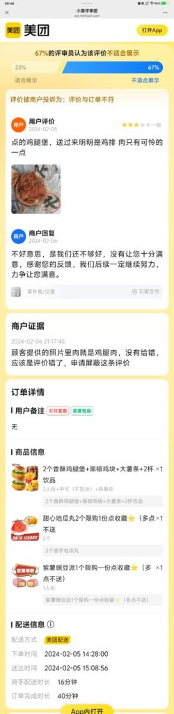 2025年8月13日 不适合展示 67%的评审员认为该评价不适合展示 用户评价2024-02-05点的鸡腿堡,送过来明明是鸡排 肉只有可怜的一点商户回复2024-02-06不好意思,是我们还不够好,没有让您十分满意,感谢您的反馈,我们后续一定继续努力,力争让您满意。