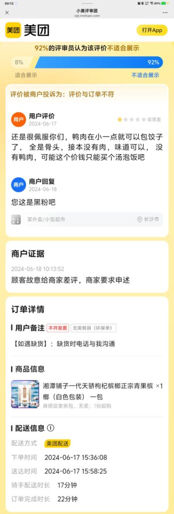 2025年8月13日 不适合展示 92%的评审员认为该评价不适合展示 用户评价2024-06-17还是很佩服你们,鸭肉在小一点就可以包饺子了, 全是骨头,接本没有肉,味道可以, 没有鸭肉,可能这个价钱只能买个汤泡饭吧商户回复2024-06-18您这是黑粉吧