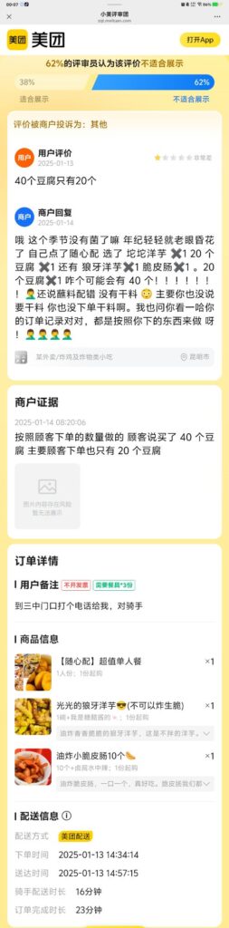 哦 这个季节没有菌了嘛 年纪轻轻就老眼昏花了 自己点了随心配 选了 坨坨洋芋 ✖️1 20 个豆腐 ✖️1 还有 狼牙洋芋✖️1 脆皮肠✖️1 。20 个豆腐✖️1 咋个可能会有 40 个!!!!!!!🤦♂️还说蘸料配错 没有干料 😳 主要你也没说要干料 你也没下单干料啊。我也问你看一哈你的订单记录对对,都是按照你下的东西来做 呀!🤦♂️🤦♂️🤦♂️🤦♂️