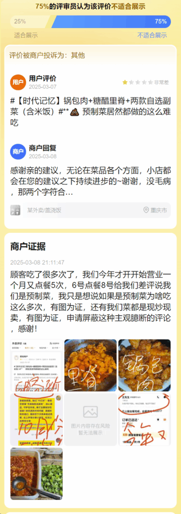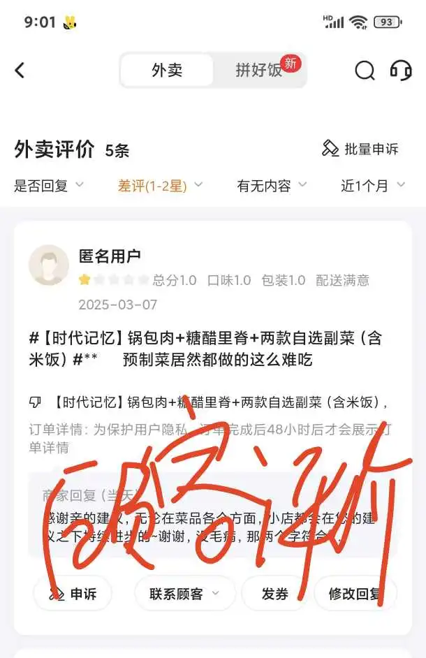 顾客吃了很多次了,我们今年才开开始营业一个月又点餐5次,6号点餐8号给我们差评说我们是预制菜,我只是想说如果是预制菜为啥吃这么多次,有图为证,还有我们菜都是现炒现卖,有图为证,申请屏蔽这种主观臆断的评论,感谢!
