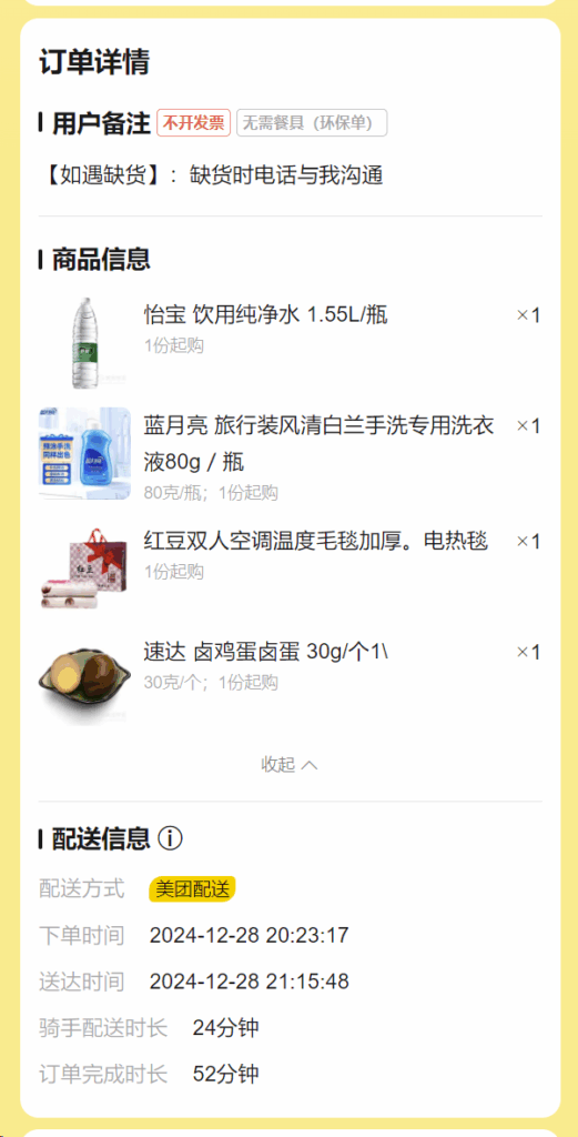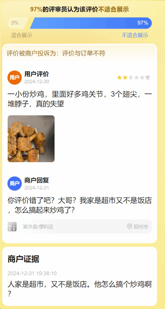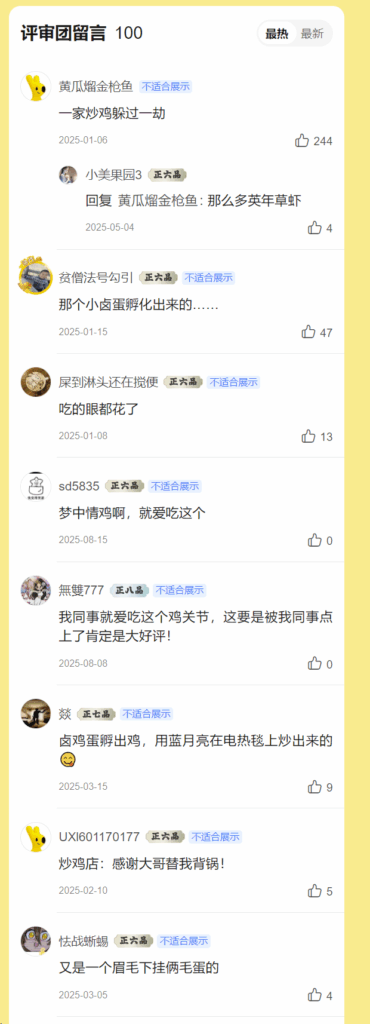 2025年8月15日 不适合展示 不适合展示 用户 用户评价 2024-12-30 差 一小份炒鸡,里面好多鸡关节,3个翅尖,一堆脖子,真的失望 商户 商户回复 2024-12-31 你评价错了吧?大哥?我家是超市又不是饭店,怎么搞起来炒鸡了?