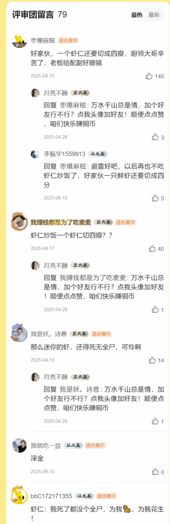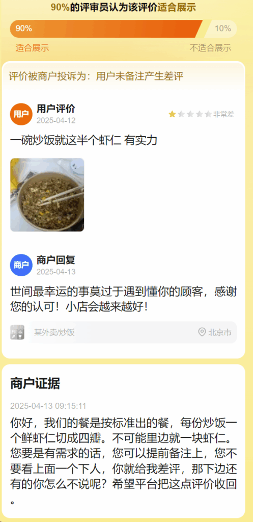 你好,我们的餐是按标准出的餐,每份炒饭一个鲜虾仁切成四瓣。不可能里边就一块虾仁。您要是有需求的话,您可以提前备注上,您不要看上面一个下人,你就给我差评,那下边还有的你怎么不说呢?希望平台把这点评价收回。