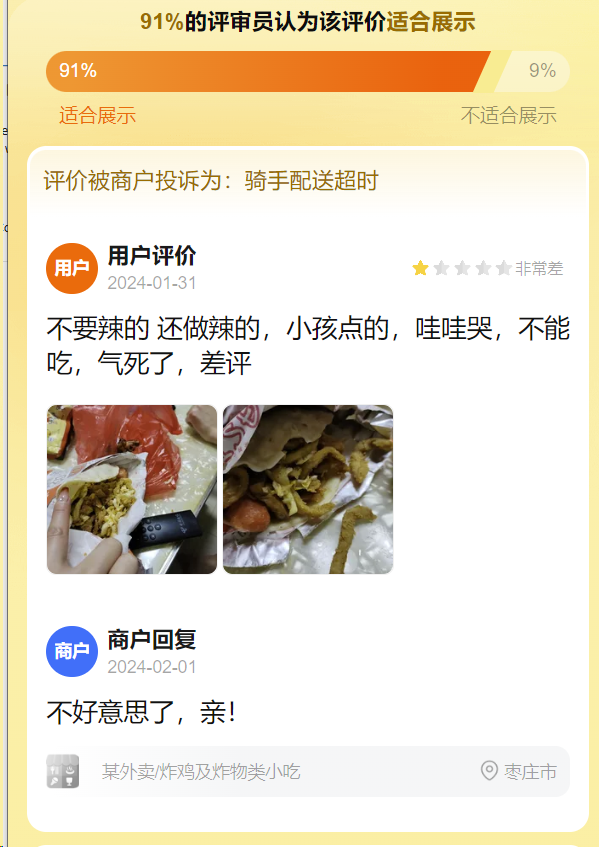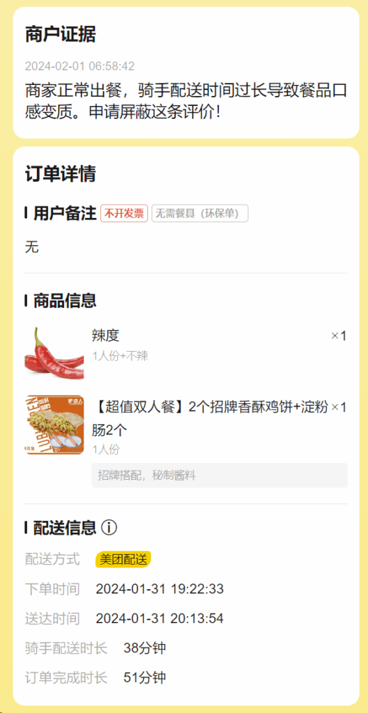 商家正常出餐,骑手配送时间过长导致餐品口感变质。申请屏蔽这条评价!