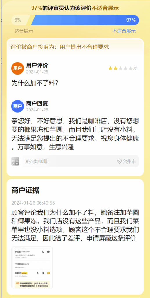 顾客评论我们为什么加不了料,她备注加芋圆和椰果冻,我门店没有这些产品,而且我们菜单里也没小料选项,顾客这个不合理要求我们无法满足,因此给了差评,申请屏蔽这条评价