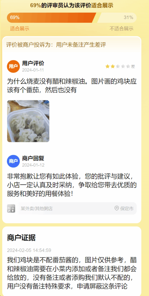 我们鸡块是不配番茄酱的,图片仅供参考,醋和辣椒油需要在小菜内添加或者备注我们都会给放的,没有备注或者添购我们默认不配的,用户没有备注特殊要求,申请屏蔽这条评论