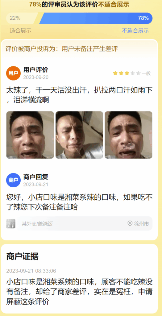 小店口味是湘菜系辣的口味,顾客不能吃辣没有备注,却给了商家差评,实在是冤枉,申请屏蔽这条评价